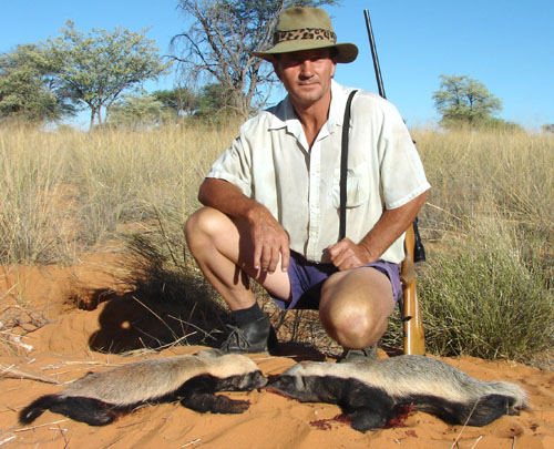 Michael went to help investigate. It was indeed two Honey Badgers. This was confirmed by the fact that lots of dribbled saliva (a typical sign) were visible on the tracks. Also, the tracks of Porcupines appear more firm in the Kalahari's sand since the Honey Badger's rolling trot makes it's tracks appear loose. The Honey Badgers had to be hunted down. We tracked the badgers one whole day and at noon the next day the tracks went into a burrow. Traps were put in front of the burrow and this did the trick. After one of these badgers were shot (a headshot), it appeared dead for ± 5 minutes. Then it suddenly started to breath and move again (we've heard of a case where a badger were bitten by a cobra and appeared dead for 2 hours before it started to move again). This seems to be very common thing of badgers.